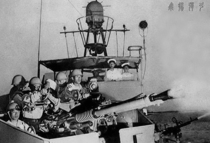 55甲护卫艇前船面的一座苏制B-11型双联装37毫米机关炮对着机风帆前列的海面打了一长串炮弹,在对方机风帆船头不远的水面激起一串水柱。可对方依然航速不减,教悔员又下令进行一次劝诫射击,一串炮弹打在距离机风帆头更近的水面上激起水柱,可机风帆依然不降速。
