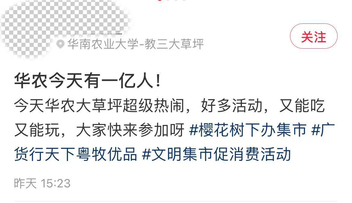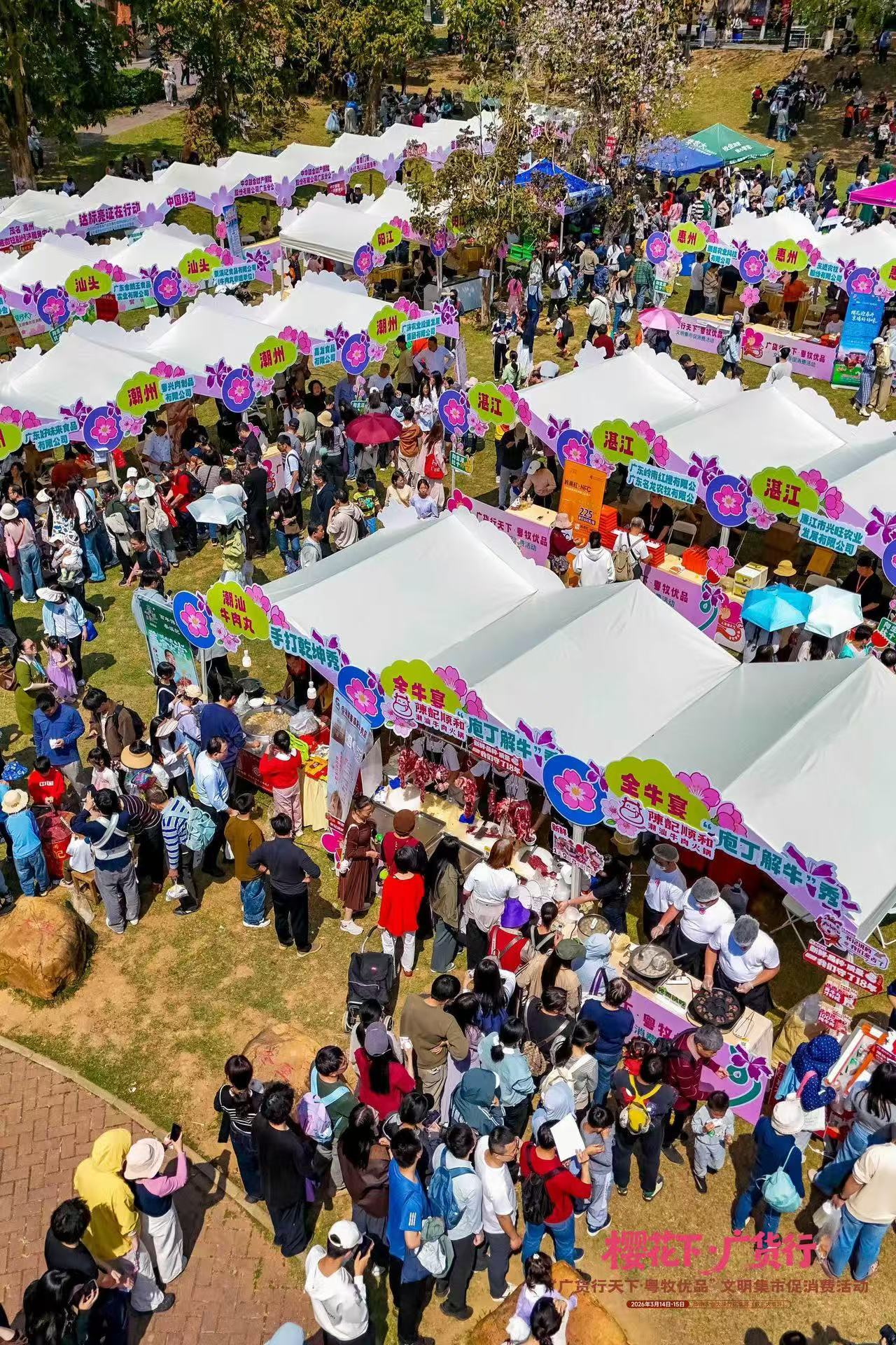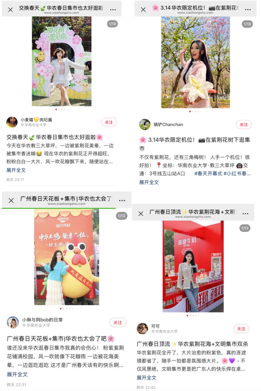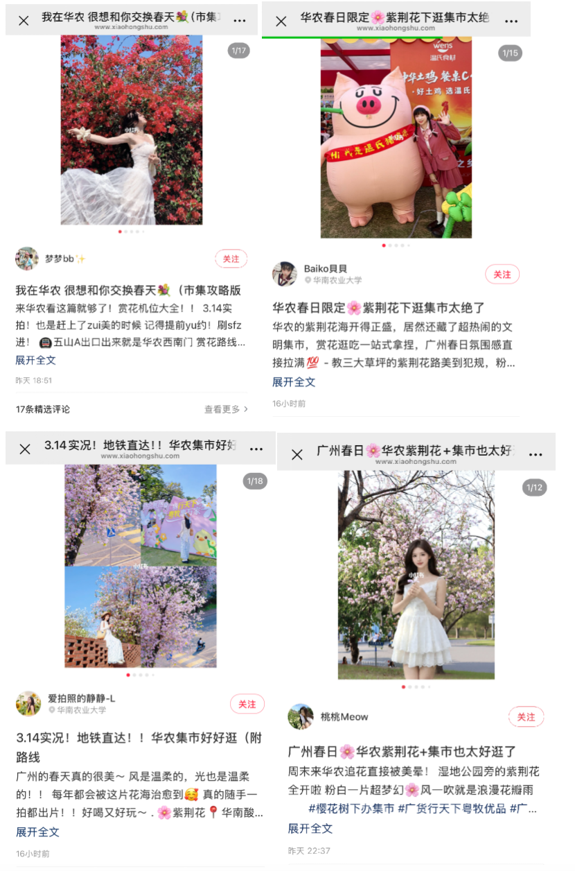 3月14日至15日,“广货行天地·粤牧优品”讲究集市促蹧跶活动在华南农业大学竹铭草海(教三大草坪)举行。活动不仅勾引多量市民、学生前来逛集市、赏春花,也在小红书等酬酢平台握续走红,不少达东说念主和网友自愿共享现场体验,“华农春日集市”“樱花下办集市”等实质刷屏酬酢平台。有博主咋舌“华农今天有一亿东说念主”!