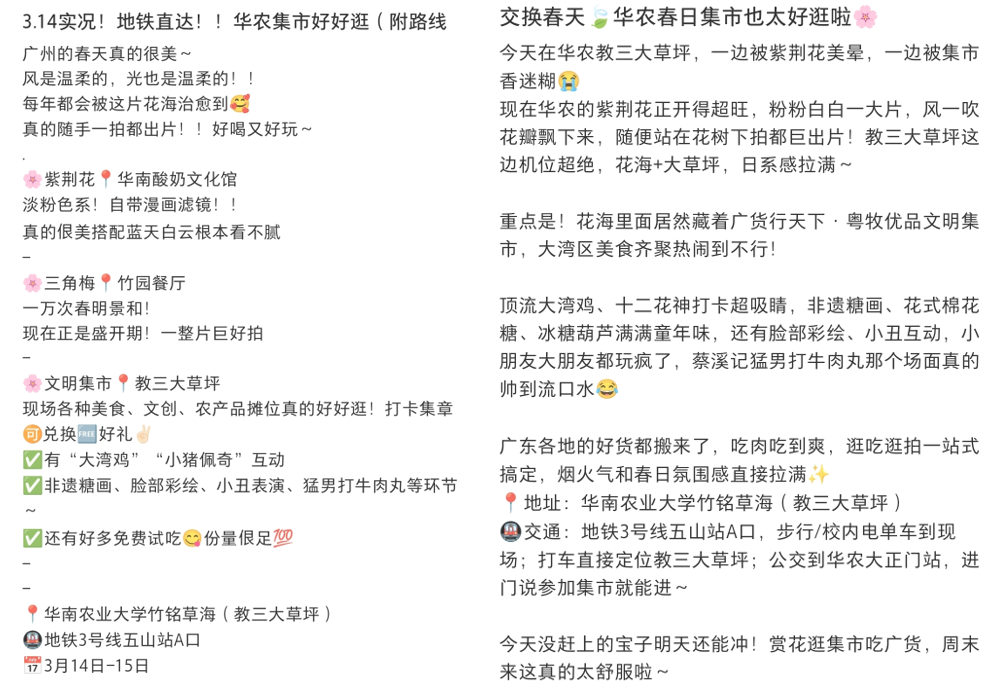 不少博主还整理出“华农赏花+逛集市攻略”,推选交通门道和打卡点,勾引更多市民周末赶赴体验。有网友留言称:“这才是广州春天该有的形势”“赏花、逛集市、吃广货,一次整体验”。
