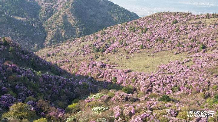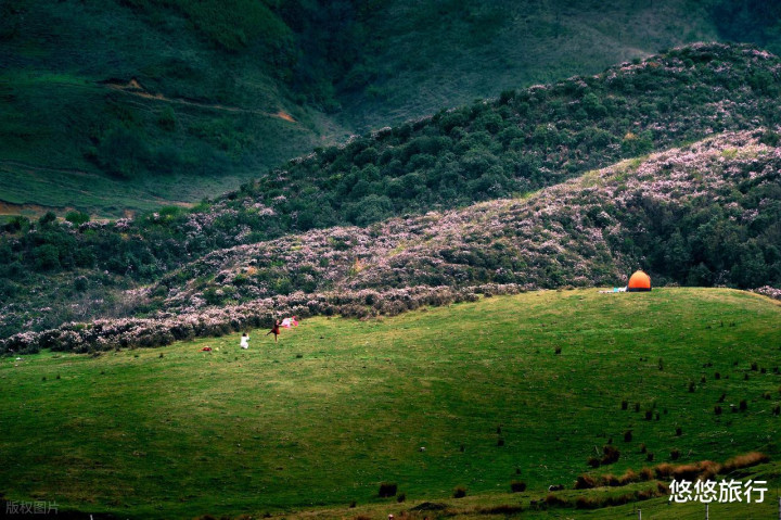 天池秘境绕湖西侧小路走200米,碰见野生杜鹃花谷。百草坪杜鹃长廊,花丛与草原牧场和会,夕阳将花海染成琥珀色。