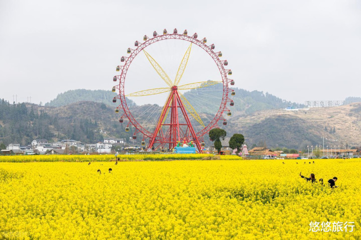 当春风拂过,金色与粉色、白色交相照映,近期粉红樱花开得正盛。登上摩天轮看全景,通盘这个词花海、村庄、远山尽收眼底。