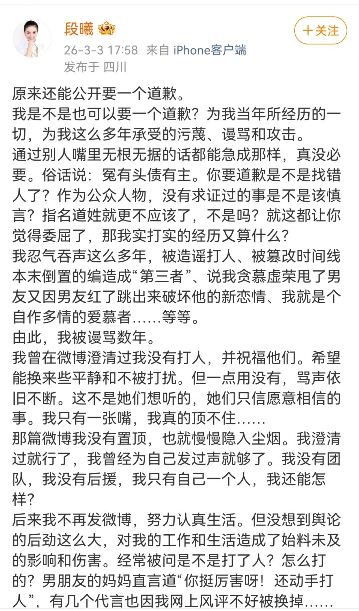 李雨桐和薛之谦之间的事儿还没平息,张杰的后院又动怒了,20多年前的女友段曦片刻发长文控诉张杰和谢娜,条目张杰和谢娜向我方谈歉,根由是张杰谢娜的粉丝网暴了她这样多年,既然谢娜能条目薛之谦谈歉,那么我方条目谢娜和张杰谈歉也不外分吧?