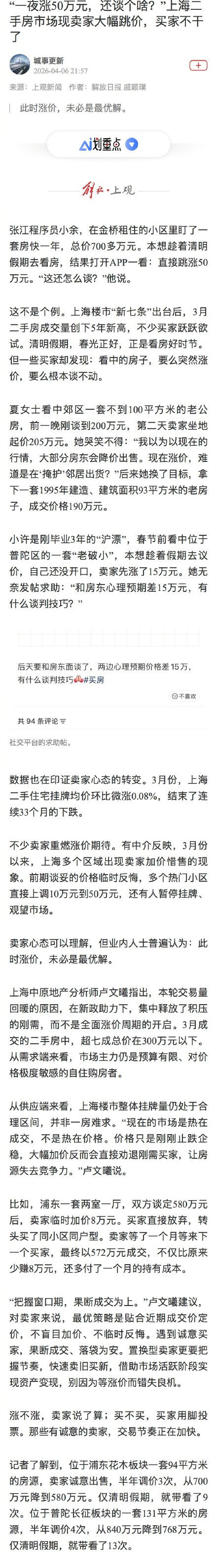 这不是个例。上海楼市“新七条”出台后,3月二手房成交量创下5年新高,不少买家撺拳拢袖。晴明假期,春光正值,恰是看房好时节。但一些买家却发现:看中的屋子,要么倏得涨价,要么压根谈不动。