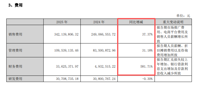 2025年,公司销售用度、处置用度、财务用度增长赫然,其中销售用度3.42亿元,同比增长37.37%,公司称主要系市集推论用度、电商平台用度及销售东说念主员薪酬增长所致;处置用度1.1亿元,同比增长31.18%,公司称系东说念主员薪酬、折旧摊销用度以及商讨用度增多所致。