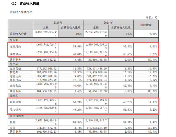 4月18日,主营宠物用品和宠物食物的浙江上市公司天元宠物发布2025年年报,公司全年终了交易收入30.02亿元,同比上升8.61%;净利5883.98万元,同比上升28.02%;扣除极度常性损益后净利4672.27万元,同比上升52.94%。