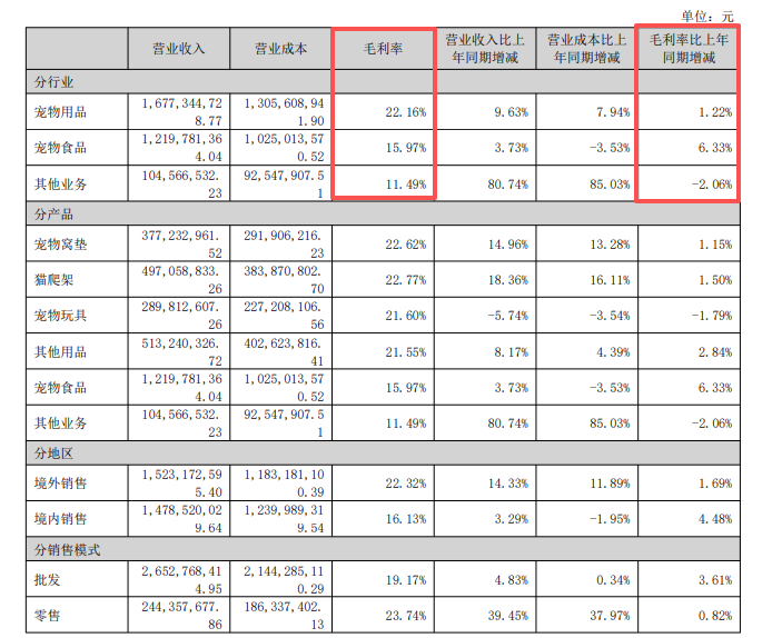 宠物食物和宠物用品的营收占比折柳为40.64%和55.88%,毛利率同比折柳擢升6.33个百分点和1.22个百分点。