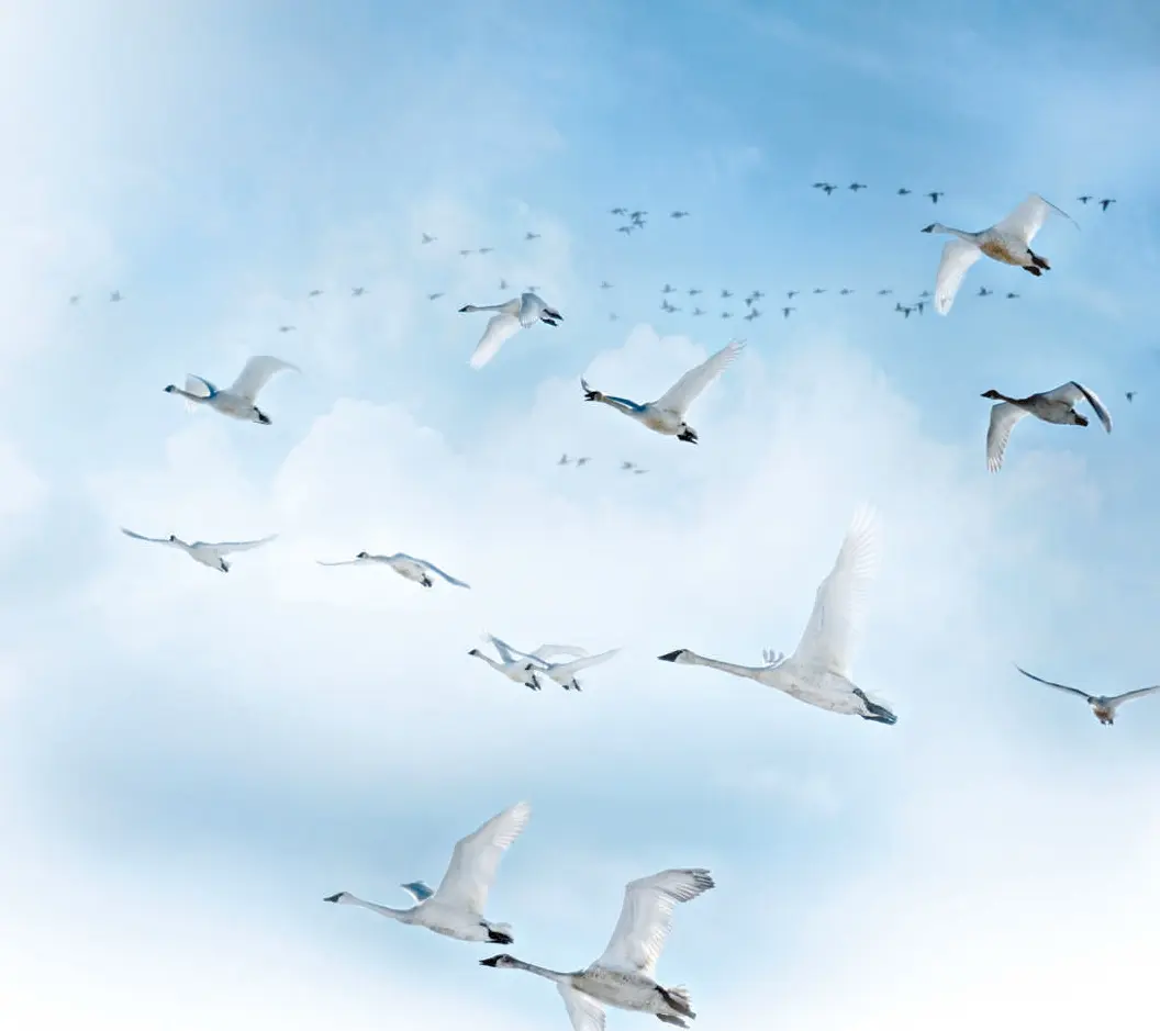 能飞越重山高山,天鹅身上有两样“法宝”。一是它们的体内有多个里面气囊,这些气囊与肺相接,在吸气时一部分空气历程肺部的氧气交换系统,另一部分则被蚁合起来恭候呼气时再通过一遍肺部进行交换,这使它们无惧高空的氧气澹泊。二是它们身上结实的羽被能更好地扇动空气,也为它们违抗了高空的严寒。有议论标明,一只成年健康的大天鹅,全身羽毛能达到25000根。“基础装备”这样王人全,难怪天鹅们心爱高飞。飞得高就能望得远,不迷途、不绕路,还莫得其它挪动鸟类挡路,天敌也较低空少得多。