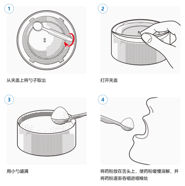 服用时,需翻开罐子、取掉夹盖,并用内置的小勺子盛满一勺(满勺1勺约0.3g),后将药粉倒在舌头上,使药粉从容溶解,并将药粉缓缓吞咽进咽喉处。需在意的是,未满3个月的儿童不行使用该居品、不同庚级段儿童相宜的用量请流露参照居品讲明书。