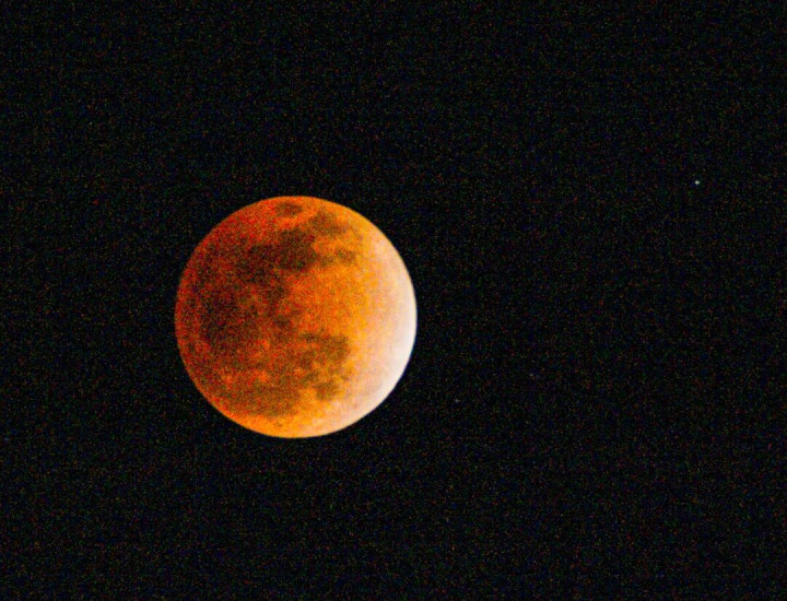 19时04分食既,月球的西旯旮与地球本影的西旯旮内切,月球刚好一谈干预地球本影内,“红月亮”取代了朔月,夜空重归暗色,被朔蟾光辉遮盖的恒星们也将逐一败露。